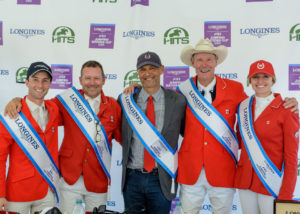 The victorious Canadian Show Jumping Team. From left to right: François Lamontagne, Eric Lamaze, chef d’equipe Mark Laskin, Ian Millar, and Tiffany Foster.